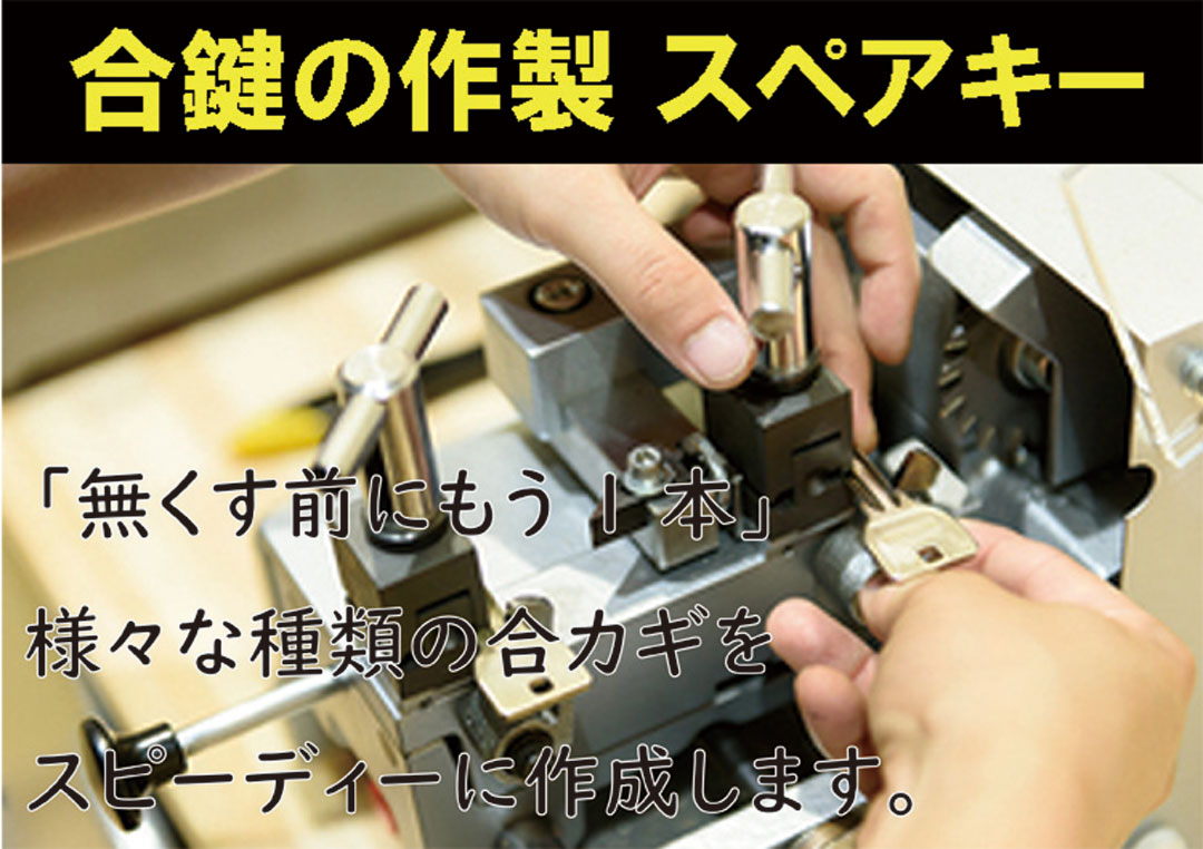 「無くす前にもう1本」。様々な種類の合カギをスピーディーに作成します。家庭の鍵、事務所の鍵、店舗の鍵、車の鍵、バイクの鍵、ディンプルキー、特殊キーなどの合鍵・スペアキーをお作りいたします。